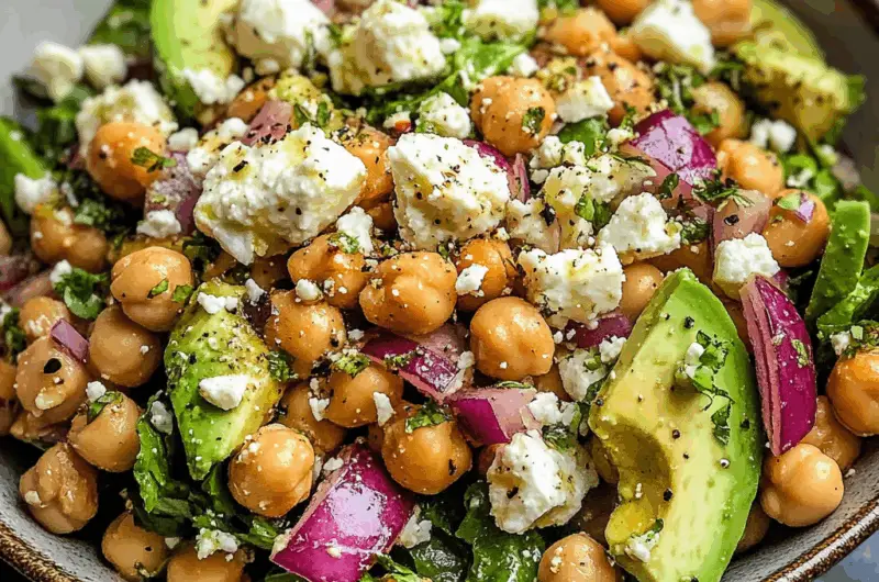 Chickpea Feta Avocado Salad is packed with health benefits. Chickpeas are an excellent source of protein and fiber, promoting satiety and digestive health. Avocados provide healthy fats and essential nutrients like potassium and vitamin E. Feta cheese adds flavor while offering calcium. The fresh vegetables in this salad enhance its nutrient profile with vitamins A and C. Overall, this salad supports heart health, aids digestion, and contributes to a balanced diet.