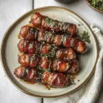 Start by preheating your oven while you wrap each sausage in bacon. Then, bake until crispy and caramelized. Finally, toss them in a sweet glaze for that irresistible sticky finish.