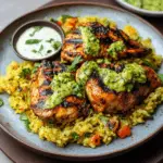 Once everything’s cooked beautifully—fluffy rice plated high next to juicy chicken—you can drizzle that luscious green sauce over both like it’s confetti at a party!