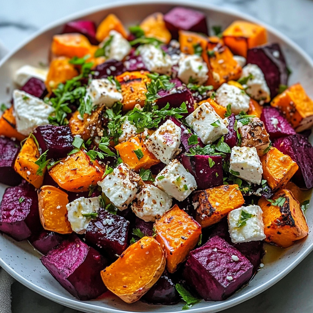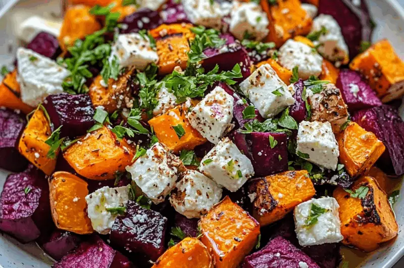 Roasted Beet and Sweet Potato Salad with Feta and Yogurt Dressing is a vibrant dish that combines earthy roasted beets, sweet potatoes, and creamy feta cheese. This salad is not only packed with nutrients but also offers a delightful mix of flavors. The yogurt dressing adds a tangy touch, perfectly balancing the sweetness of the vegetables. Ideal for both casual meals and special occasions, this salad can serve as a hearty main dish or a colorful side. For more inspiration, check out this Baked Apples with Feta recipe.